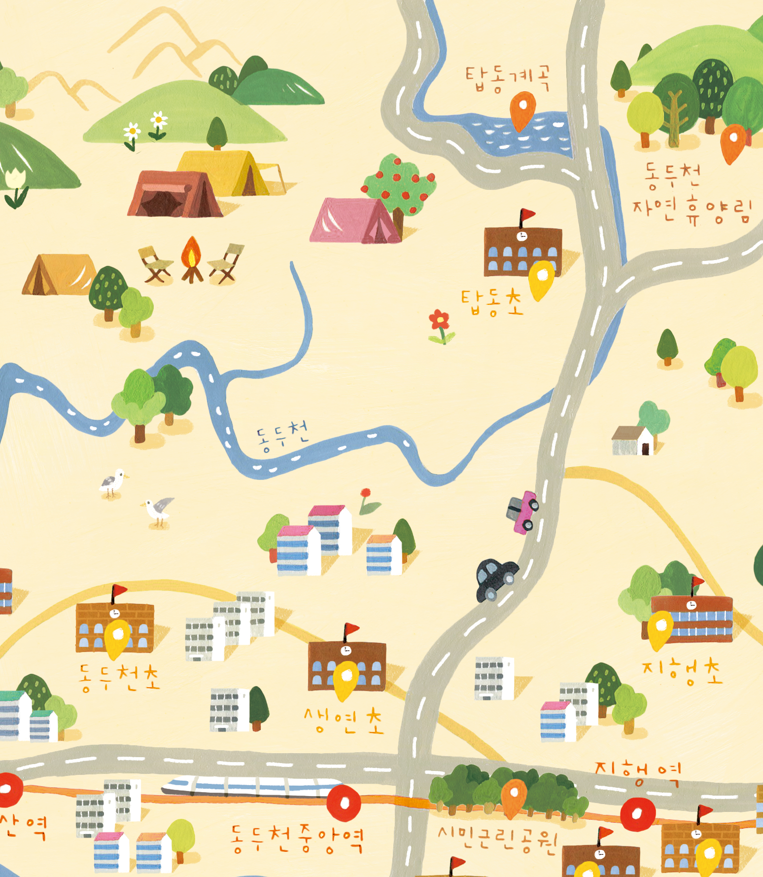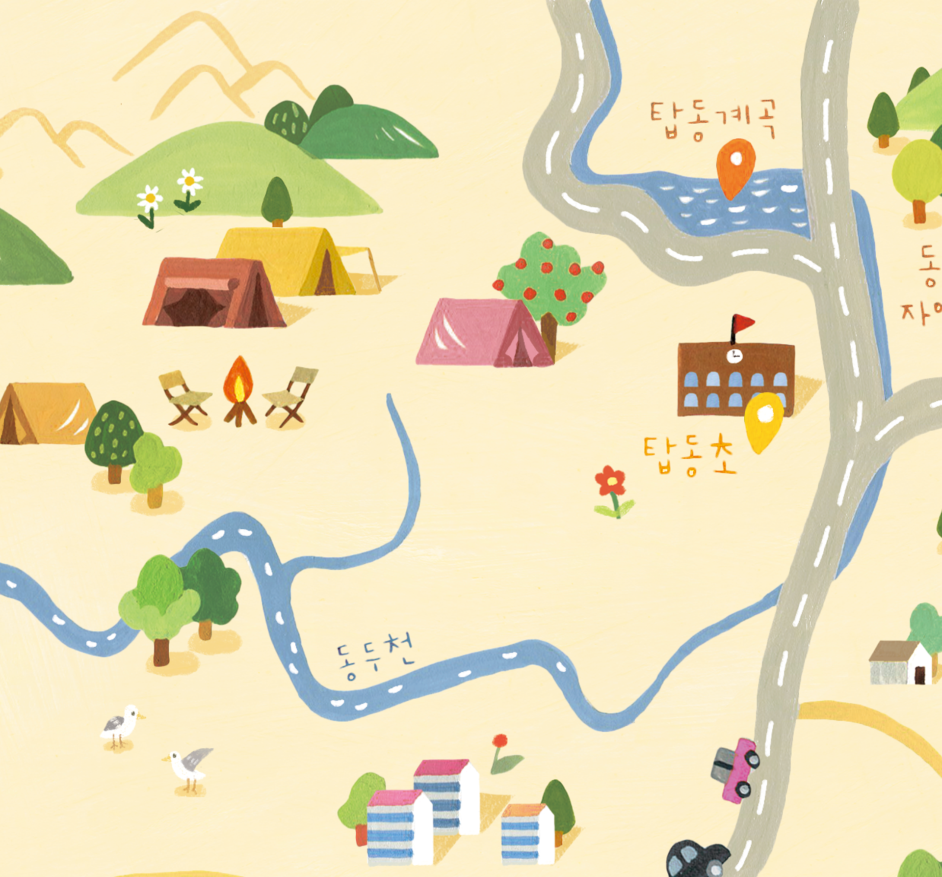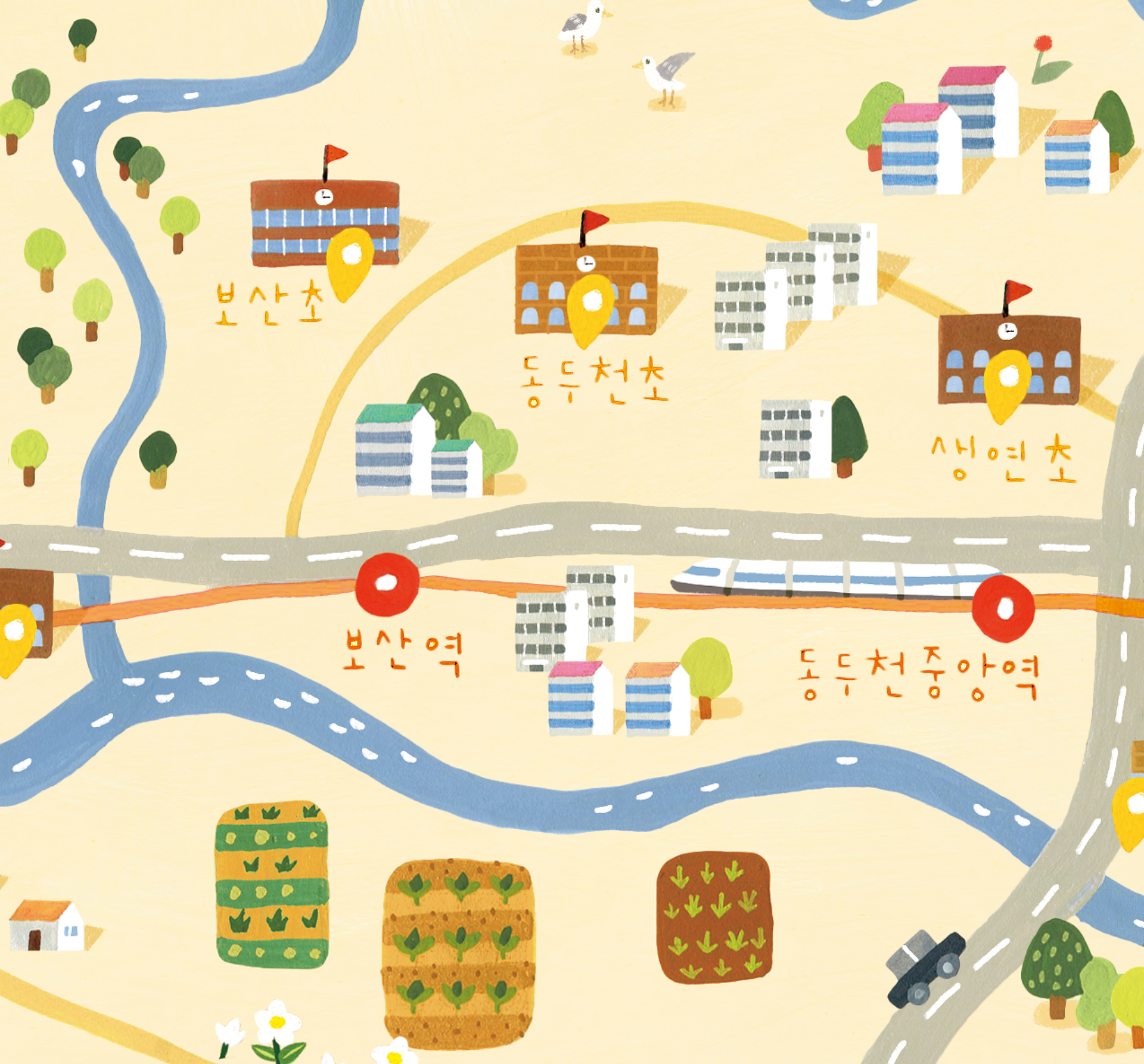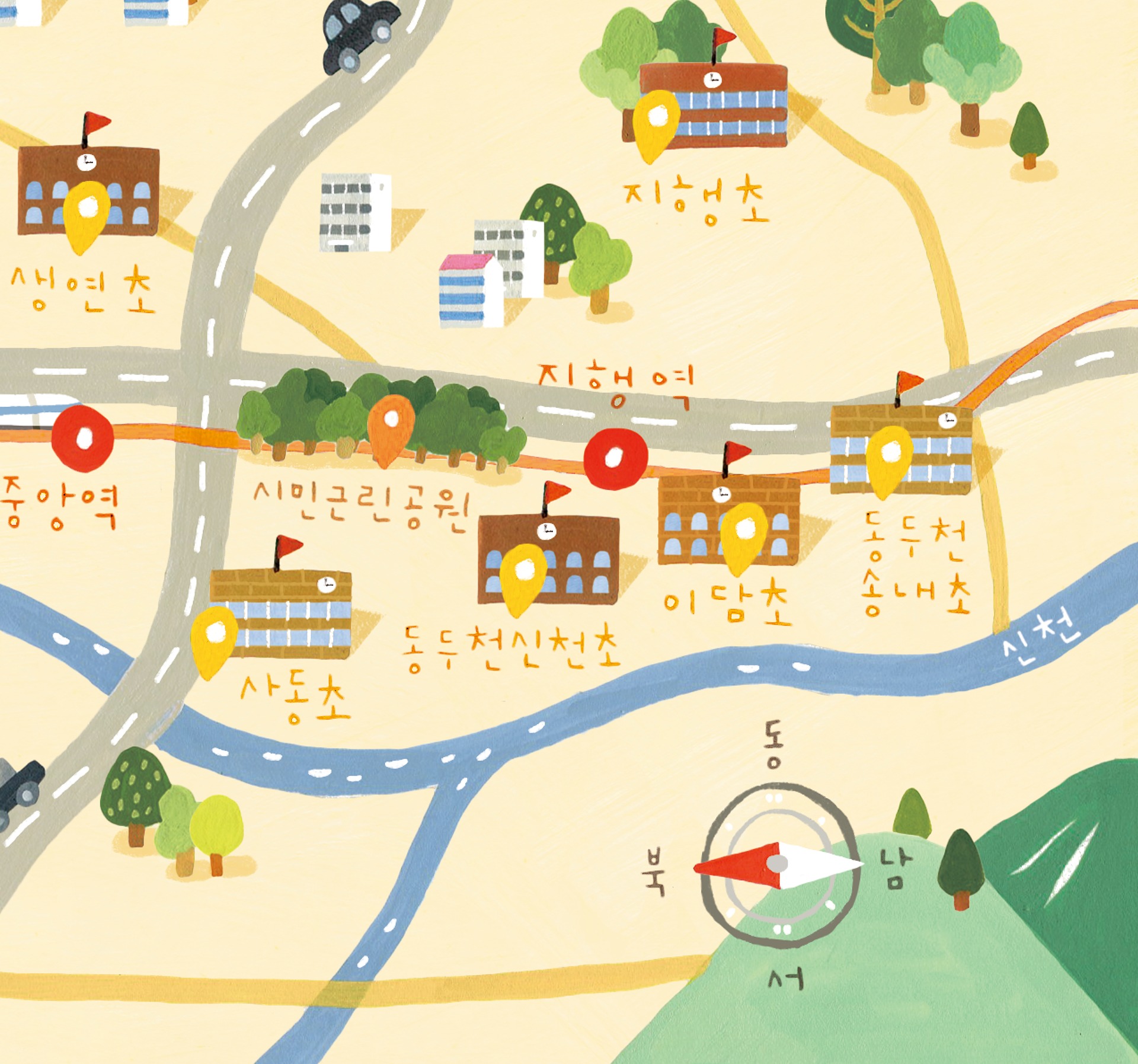 지역에 살고 있는 아이들의 초등학교와 마을의 중요한 위치들이