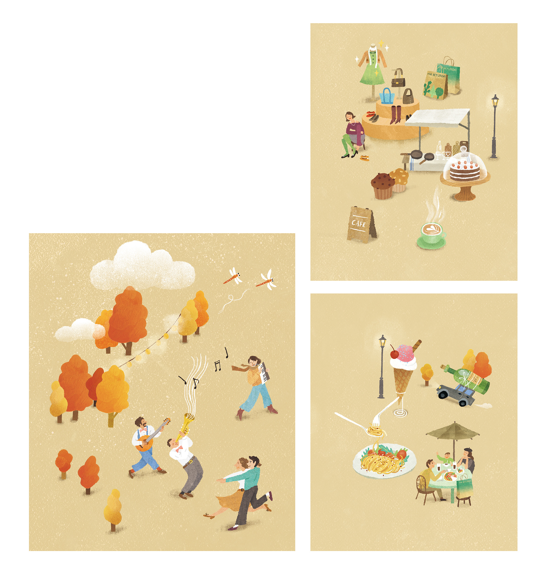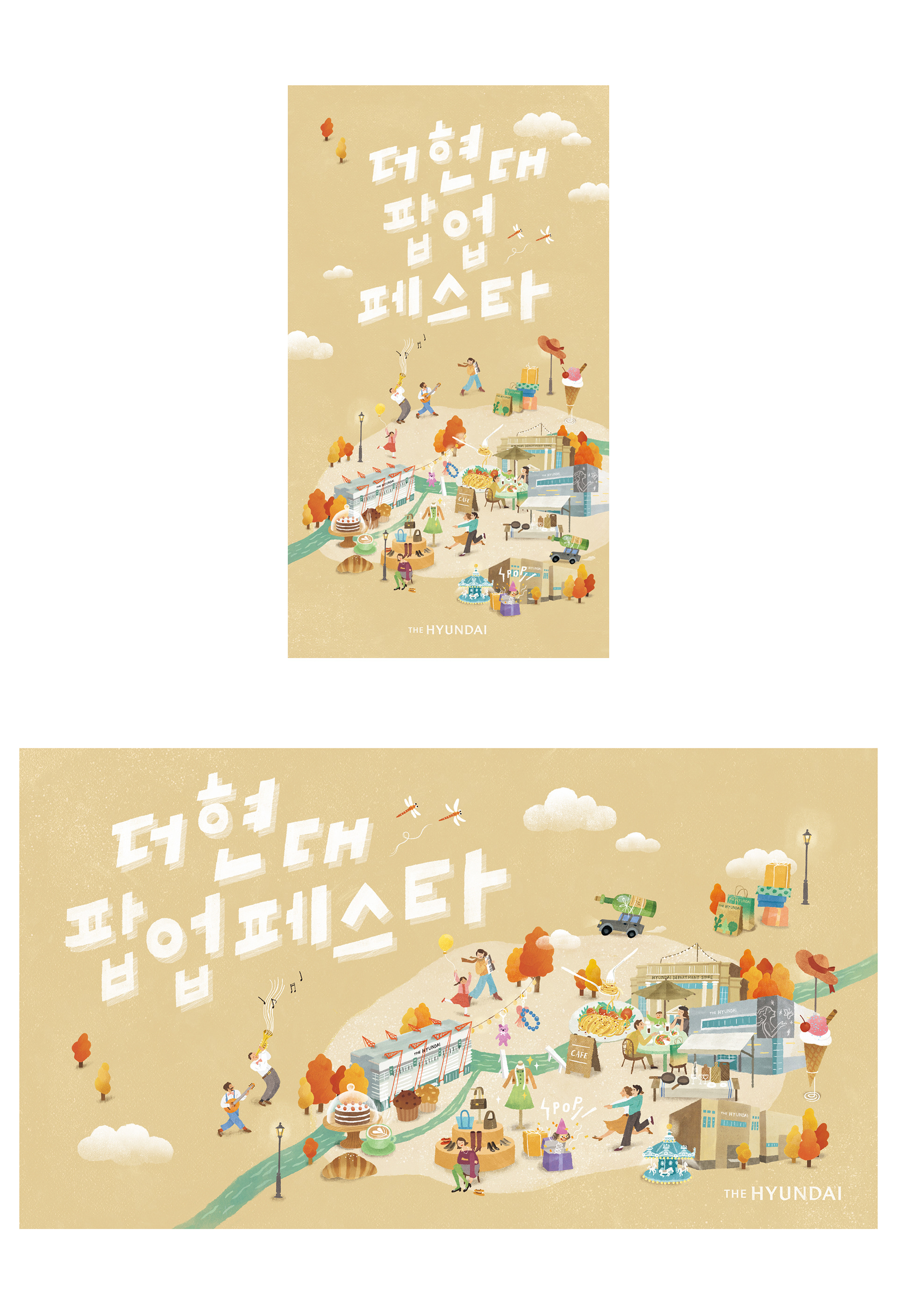 가을 시즌 분위기를 반영하였으며 서울의 현대백화점 4곳의 외관과 팝업 빌리지에서 축제를 즐기고 있는 사람들, 더불어 음식과 상품들을 메인 타이틀과 함께 어우러지도록 표현하였습니다.