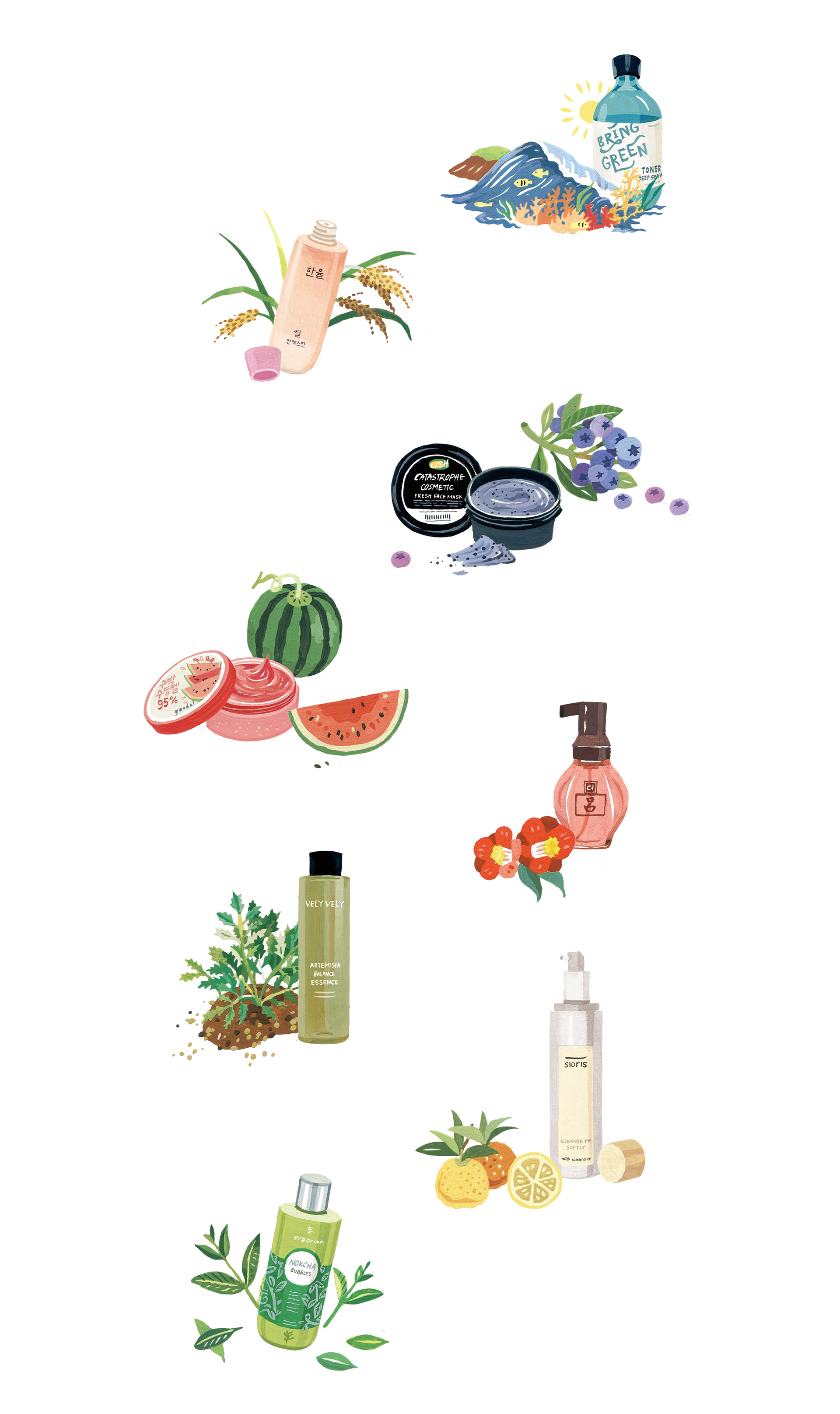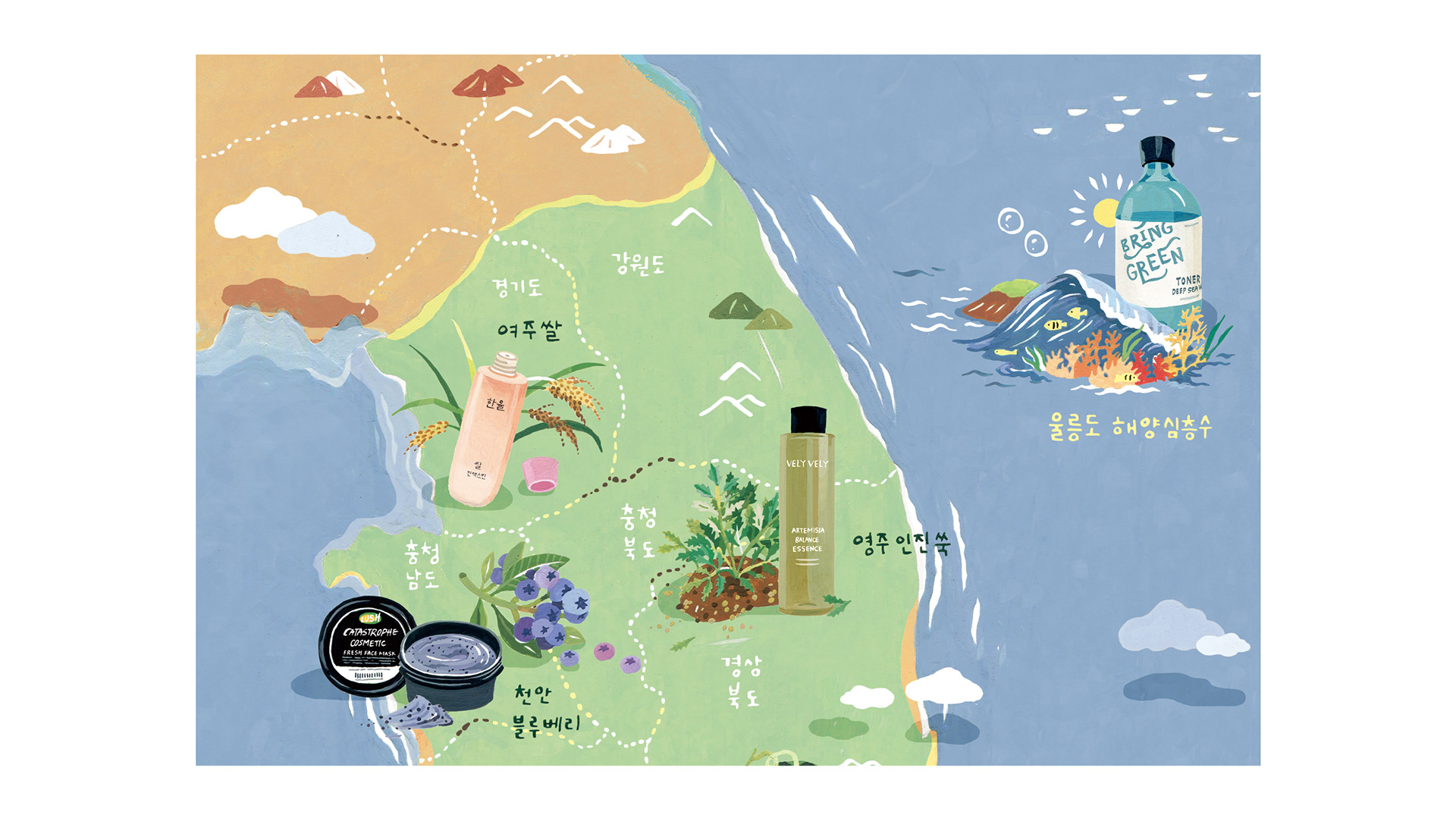 얼루어 7월호 '팔도 화장품' 대한민국 곳곳에서 자라나는 화장품 원료들을 소개하는 지도 일러스트 작업입니다.