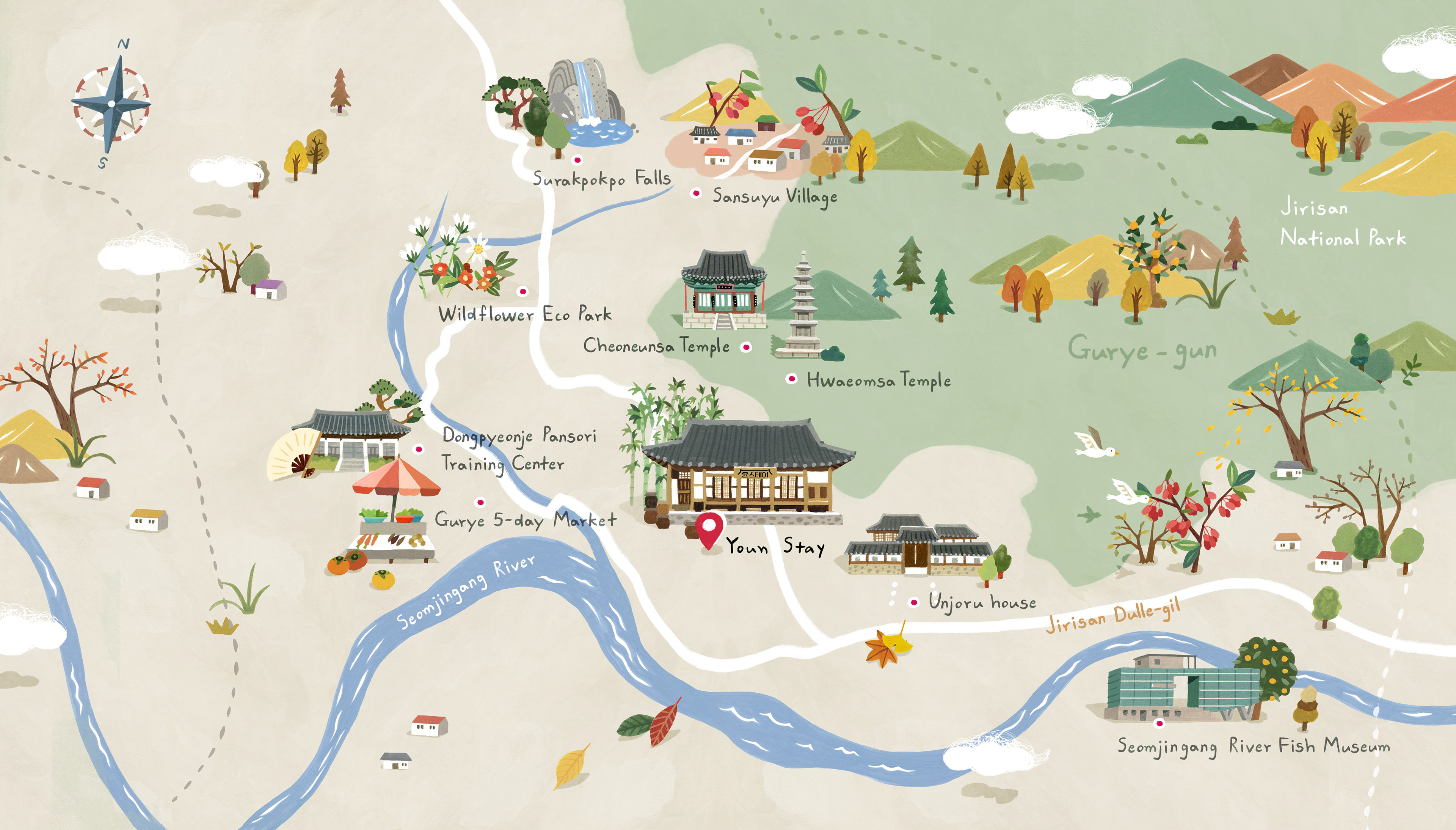 구례 지역의 명소들과 윤스테이의 위치를 간략히 소개합니다.