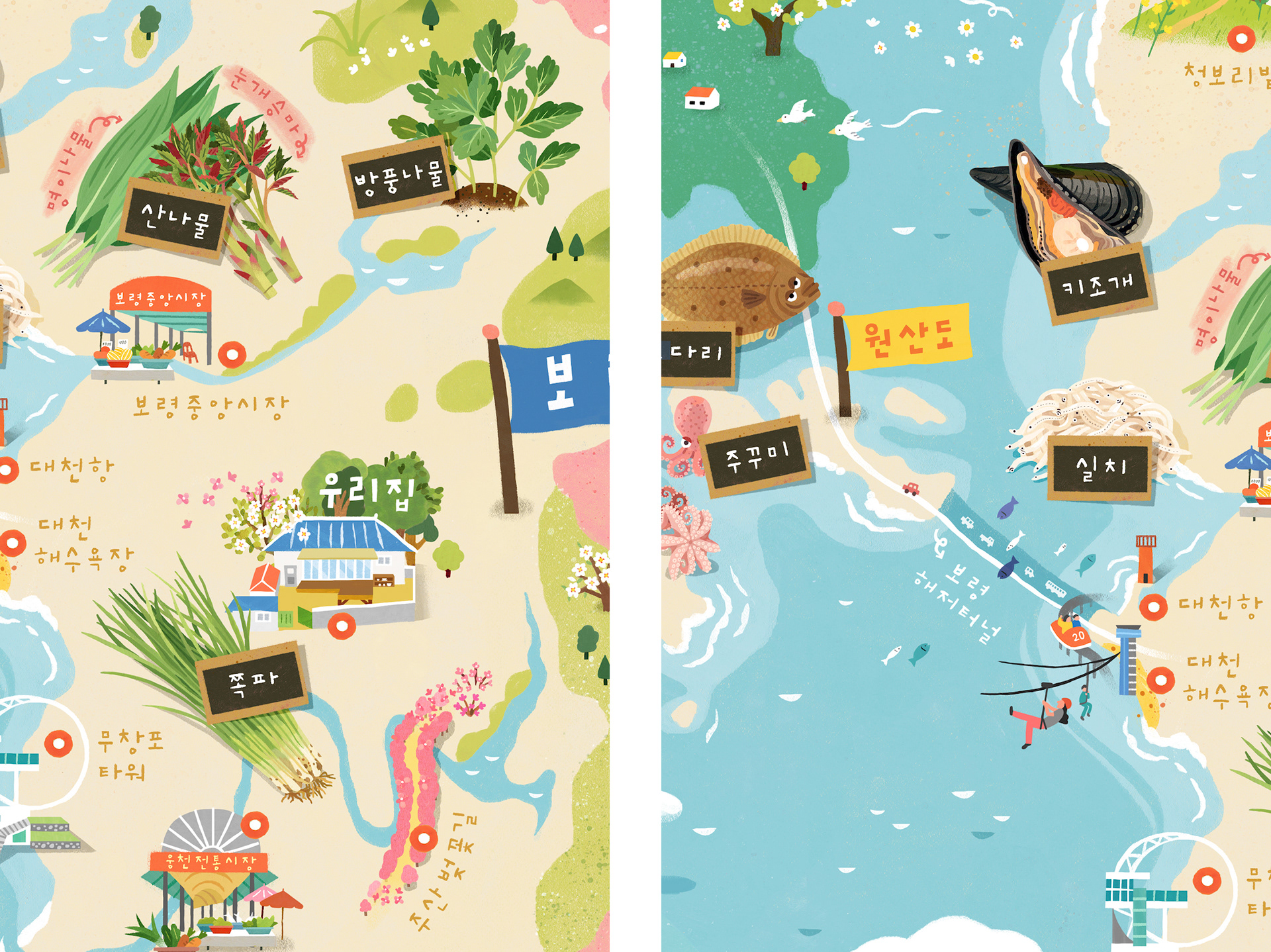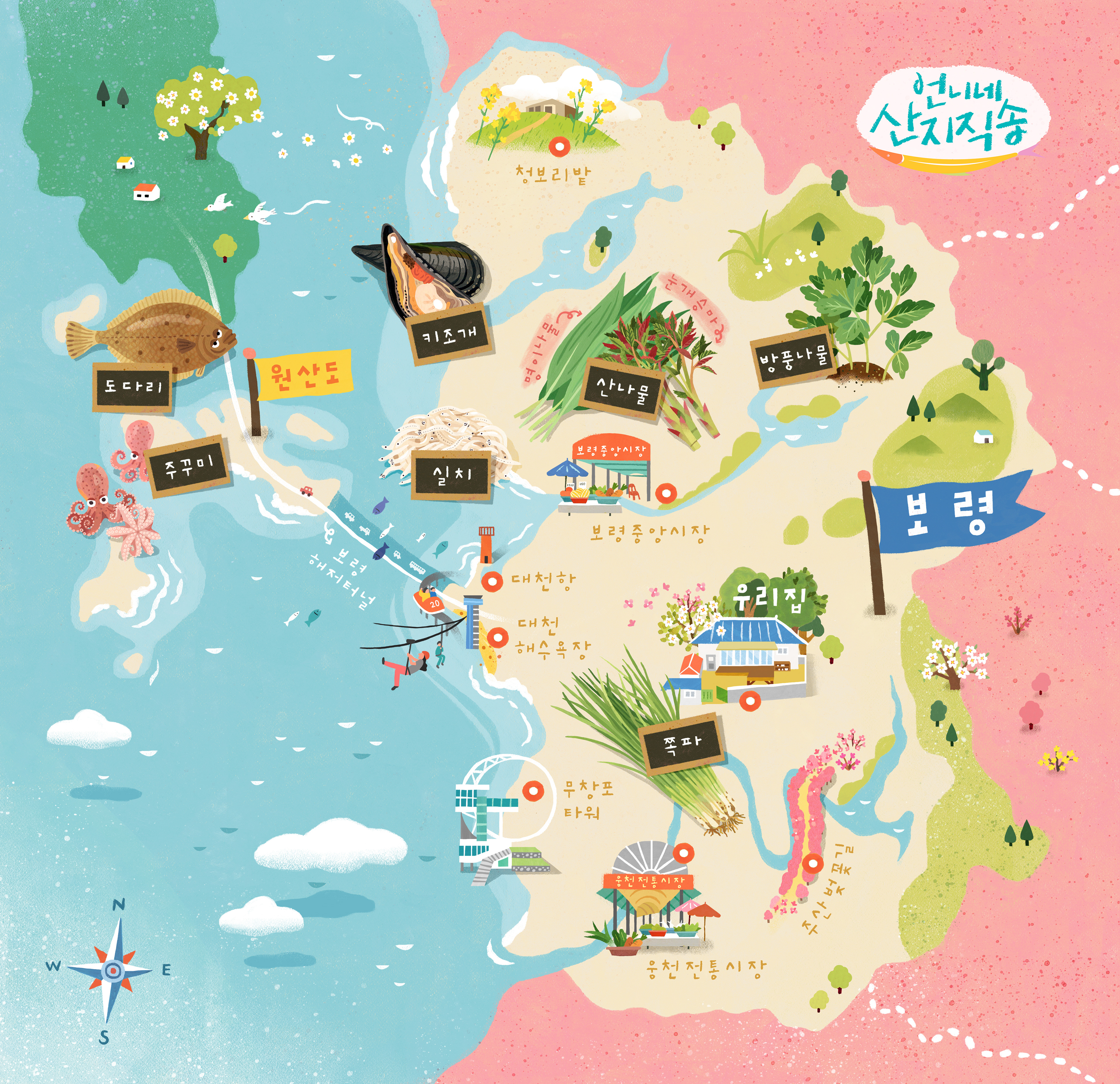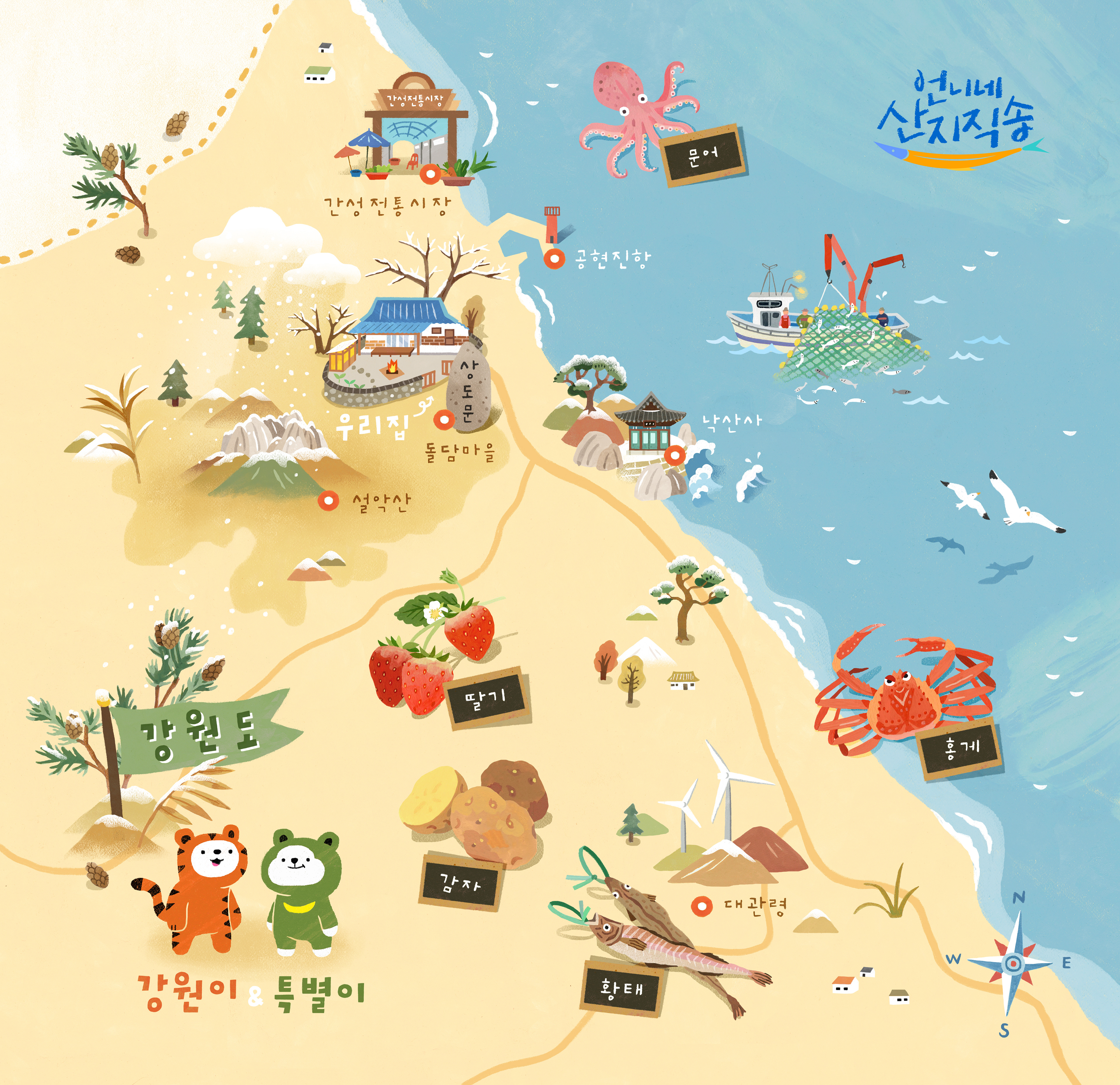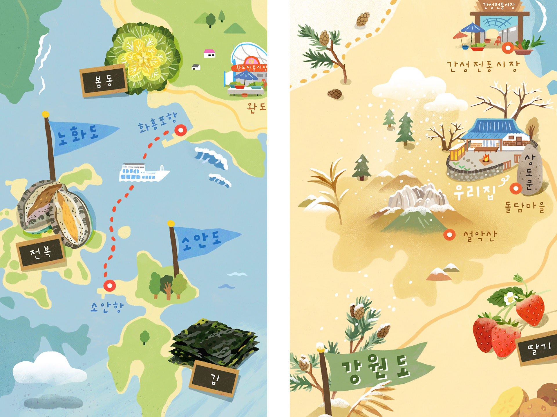 tvN '언니네 산지 직송'의 지역 지도, 특산물, 출연진 캐릭터 일러스트를 작업하였습니다.